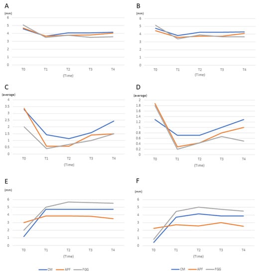 The p-values of the three groups between T0 and T1 were 0.082 (CM), 0.053 (APF), and 0.008 (FGG). There were no statistically significant differences observed between T0 and T2 (p = 0.190 (CM), p = 0.114 (APF), and p = 0.065 (FGG)). However, in the FGG group, a significantly different value was observed at T3 and T4 than at T0 (T3: p = 0.022 and T4: p = 0.044). There was no difference in the other groups at T2, T3, and T4.