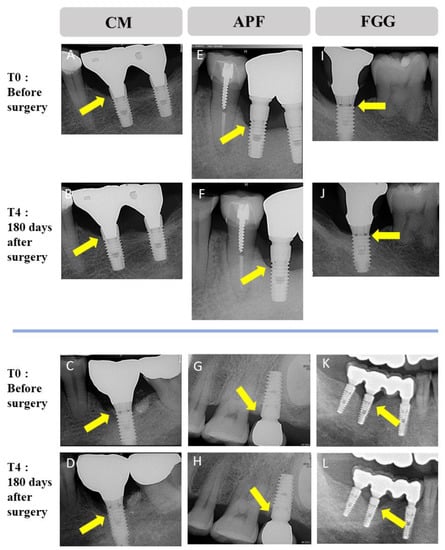 An experienced periodontist (J.T.L) measured all clinical parameters (probing pocket depth (PPD) and BOP) at six sites per implant using a periodontal probe (PCP-12, Hu-Friedy, Rotterdam, Netherlands). The initial examination was performed before surgery (T0). Follow-up examinations were conducted at the following time points: 30 (T1), 60 (T2), 90 (T3), and 180 (T4) days after the surgery (Figure 2). The horizontal/vertical KM width (vertical KM width: a distance from the free gingival margin to MGJ (mucogingival junction); horizontal KM width: a distance between the extension lines in the apical direction at the mesial and distal margin of the implant prosthesis) was measured at the buccal aspect of each implant, whereas the augmented sites were evaluated in terms of their clinical appearances (texture and color) using the clinical photo by two independent investigators (H.S.C and J.T.L). The method was a modification of the method reported by Lim et al. []. Regarding peri-implantitis disease classification, we used a cone-beam computed tomography (CBCT) scanner (Kodak 9500®, Carestream Health, Rochester, NY, USA) in this study, which provides a grayscale image of 14 bits with a voxel size of 0.2 mm per side. The CBCT images were viewed using 3D imaging software (OnDemand 3D, Cybermed Co., Seoul, Korea). Panoramic and intraoral radiographic X-ray was also used. Based on these data, all implants were classified according to previous studies [,]. Two investigators (H.S.C and J.T.L) also evaluated the classification of each implant.