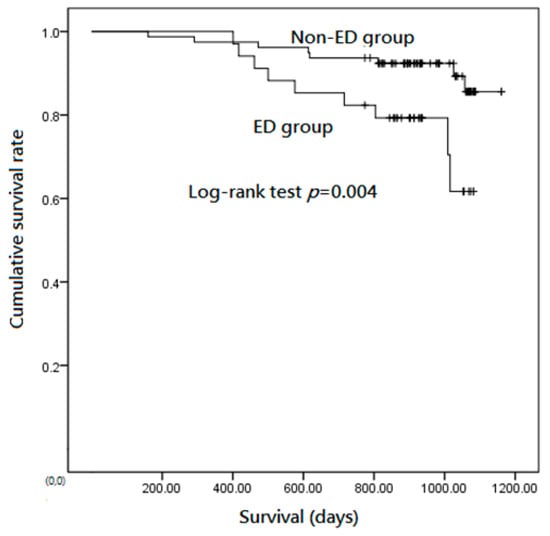 Continuous variables are expressed as mean ± standard deviation, and categorical variables are expressed as absolute values and percentages. Univariate and multivariate analyses between the ED and non-ED groups were performed using Student’s t and linear regression tests. In the multivariate analysis, we reanalyzed the variables with a p-value < 0.1 in the univariate analysis. The cumulative survival rate was estimated by the Kaplan–Meier method using the log-rank test. Cox regression analysis was used to estimate the hazard ratio of mortality (HR). Two-tailed p < 0.05 was considered statistically significant. The SPSS program (version 22.0; SPSS Inc., Chicago, IL, USA) was used for statistical analysis.