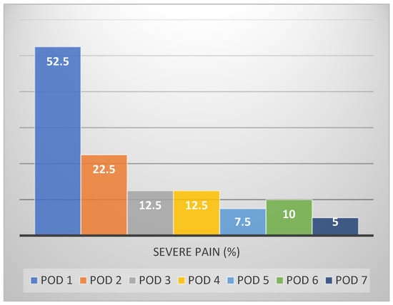 On postoperative day (POD) 1, 52.5% of the patients reported severe pain (score 8–10/10) at some point in the day (Figure 1), decreasing gradually by POD 2 to 22.5% and by POD 3 to 12.5%.