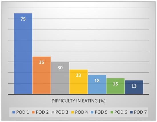On POD 1, difficulty in eating (Figure 2) was the most frequently reported feature (75%), followed by swelling (62.5%), inability to enjoy regular food (50%), substantial interference in daily activity (27.5%), and absence from work (25%).