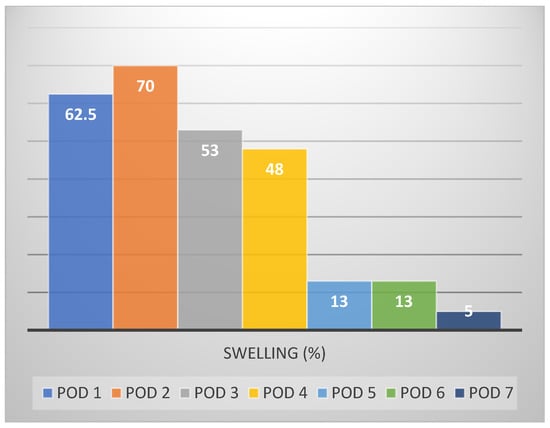 Swelling, the major distressing postoperative symptom (Figure 3), resolved by POD 4–5 (13%); bleeding, food stagnation, bad taste/smell, bruising, and malaise were only marginally evident to patients in the recovery period.