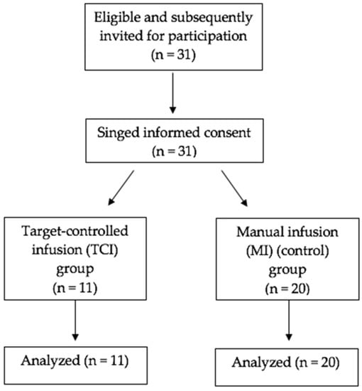 Held in 2020, the prospective study was hosted by the Hospital of the Lithuanian University of Health Sciences Kauno Klinikos. After having obtained the written consent of the patients and the approval of the local Ethics Committee (BEC—MF—39), 31 morbidly obese patients were enrolled in the study. The inclusion criteria were: II or III ASA physical status, >18 years, gastric bypass surgery with general remifentanil anaesthesia. Study exclusion criteria were: a history of opioid usage to treat chronic pain, opioid dependence, and age under 18 years.