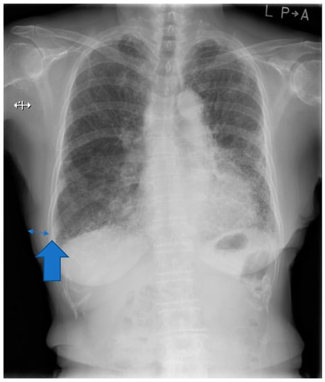 The soft tissue thickness from the chest radiograph of the posterior-anterior view in an erect position was assessed. The positive associations between BMI and progression of IPF were previously described in the literature [,]. The soft tissue thickness of the right 9th rib is usually the thinnest in the thoracic cage []. The right 9th rib is an adequate anatomical landmark for the evaluation of soft tissue thickness. The measurement of the soft tissue thickness at the right 9th rib is outlined in Figure 1. The distance between the outer edge of soft tissue and that of the right 9th rib was defined as soft tissue thickness measured on the posterior-anterior view. Furthermore, we reviewed the chest high-resolution computed tomography (HRCT) pattern at diagnosis of IPF based on the latest international IPF guideline [].