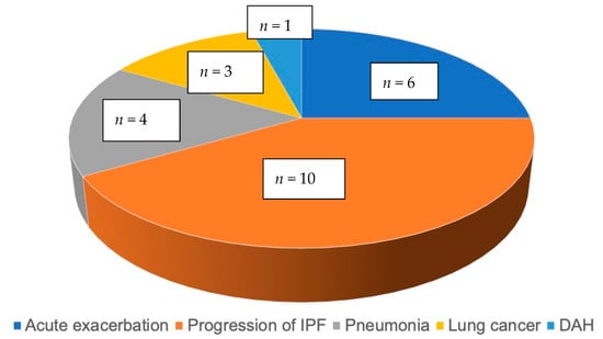 Causes of death (n = 24). Abbreviations: IPF; Idiopathic pulmonary fibrosis, DAH; diffuse alveolar hemorrhage.