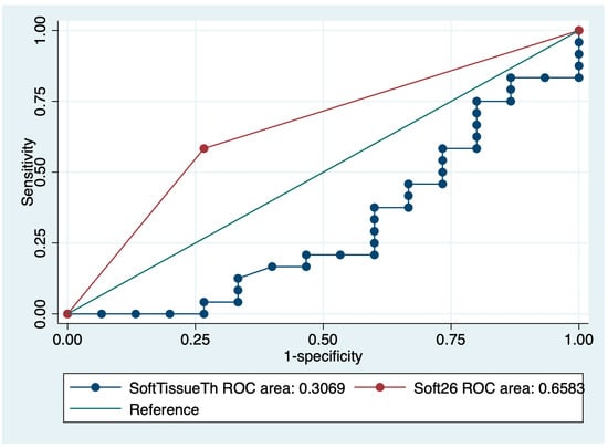 The ROC curve showed the adequate threshold of IPF mortality was a soft tissue thickness of about 26 mm. The area under the curve of 26 mm was 0.658 (Figure 3). The Kaplan–Meier survival curve in the under 26 mm group showed poor prognosis compared to the over 26 mm group (p = 0.01) (Figure 4).