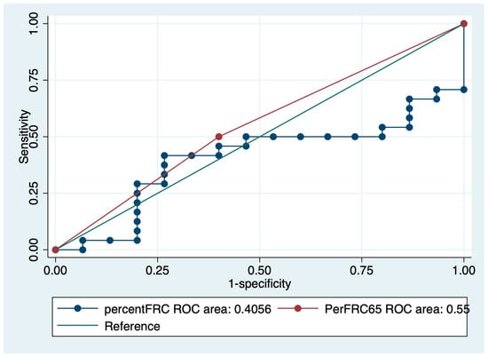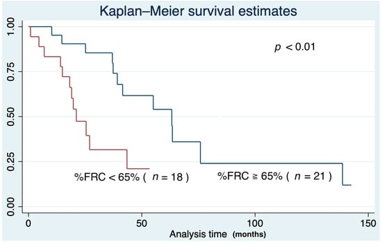 Another ROC analysis showed the threshold of IPF mortality was 65% in %FRC. The area under the curve of 65% was 0.55 (Figure 5). The Kaplan–Meier survival curve indicated the under 65% group showed a poor prognosis compared to the over 65% group (p < 0.01) (Figure 6).