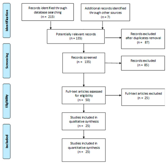 The PRISMA flow chart and checklist for systematic review is shown in Figure 1. The initial search produced 135 potentially relevant articles. After 85 articles were screened for relevance of titles and abstracts, 50 full text articles were further assessed for eligibility and 25 were excluded ( Supplementary Table S1); thus, 25 trials were included in the review [16,17,18,19,20,21,22,23,24,25,26,27,28,29,30,31,32,33,34,35,36,37,38,39,40]. Their characteristics are reported in Table 1, Table 2, Table 3 and Table 4.