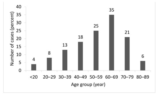 A total of 1875 patients were found to have been diagnosed with HZ during the study period, with 163 having been specifically diagnosed with HZO. Through detailed medical chart review, we excluded 33 patients who were misdiagnosed as having HZO, who had undergone ophthalmic surgery less than a year before the manifestation of HZO, or who had a history of ophthalmic disease that could affect the development and progress of the disease; thus, 130 patients were included in the final analysis. Demographics and characteristics of the study population are summarized in Table 1. The male to female ratio was 1.03. No significant sex difference was observed (p = 0.8608). In male patients, 12 had chronic and five had relapsed HZO; among the female patients, 19 had chronic and 14 had relapsed HZO. The mean age of the study participants was 55.18 ± 17.66 years (range: 11–89 years). The majority of patients were immunocompetent (89.23%). The mean treatment duration was 82.22 ± 199.56 days (range: 3–1575 days), and the median value of treatment duration was 11 days. The distribution of HZO patients according to their age is shown in Figure 1. Of all of the HZO patients, most were in their 60s, followed by in their 50s and 70s (35%, 25%, and 21%, respectively).
