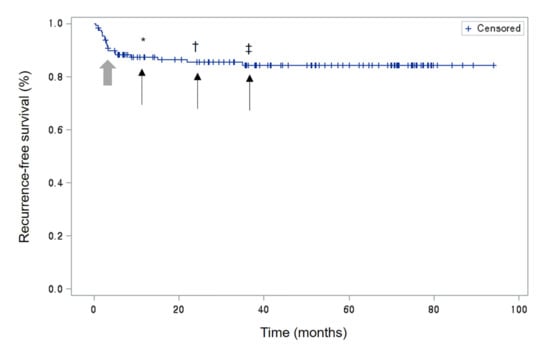 Kaplan–Meier survival analysis demonstrating cumulative recurrence-free survival over time. Within one year, 89.5% of all events recurred; the curved point (bold arrow) of the graph corresponds to 8.6 months. * One-year survival was 87.44%. † Two-year survival was 85.5%. ‡ Three-year survival was 84.38%.