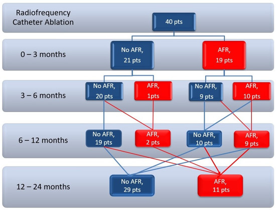 Regarding early assessment, recent studies show that AFR, particularly in the latter part of the blanking period, after the first month, can predict future AFR [18,37,38]. Willems et al. showed that patients with AFR in the second part of the blanking period also have higher risk of long-term AFR (more than 90% of patients from their study that were diagnosed with recurrences in the third month also had late AFR) [38].