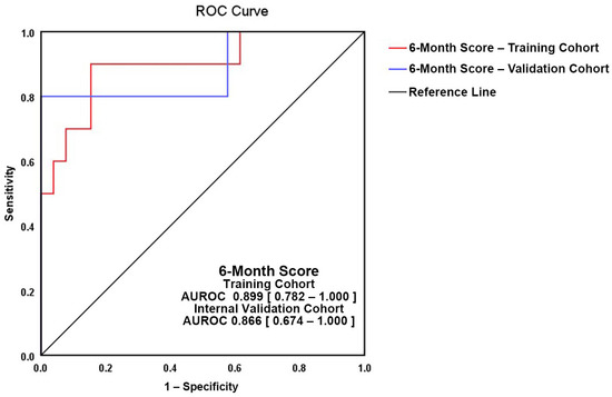 The validation of our 12-month score model (depicted in Figure 5) was performed internally. The two AUROC curves show good superposition (training cohort: AUROC = 0.812, 95%CI = 0.642–0.982, p = 0.001 versus validation cohort AUROC = 0.798, 95%CI = 0.550–1, p = 0.039) with no significant difference between areas (0.028, 95%CI = −0.179–0.235) and a Hanley and Mc Neil test p-value of 0.789.