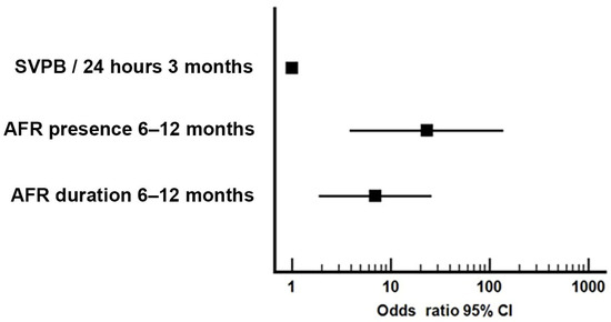 Patients with AFR between 6–12 months had a significantly higher rate of AFR compared with AFR-free patients during previous periods (between 0–1 months p = 0.004, 1–3 months p = 0.01, and 3–6 months p = 0.002) and also presented more SVPB/24 h at 3 and 6 months Holter ECGs (p = 0.005, p = 0.009). All statistically significant variables between the groups, measured up to 6 months (Table 3), were evaluated by univariate analysis. Ten independent predictors for late AFR were found: AFR presence, number, and duration of episodes in the first month; AFR presence, number, and duration of episodes between 1 and 3 months; presence and number of AFR between 3 and 6 months, and SVPB by continuous ECG monitoring at 3 and 6 months (Table A2).