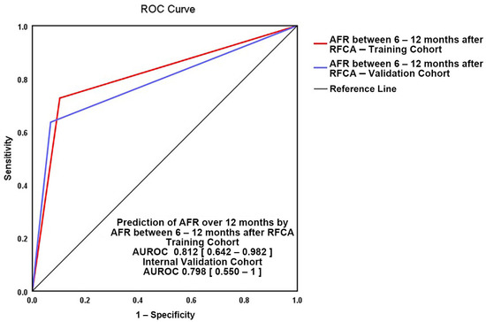 Validation of “AFR between 6–12 months” for atrial fibrillation recurrence (AFR) prediction after 12 months from RFCA. Red line—study group, blue line—validation subgroup.