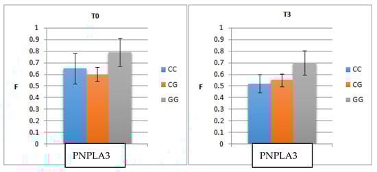 Correlation of pre- and post-treatment fibrosis (three months post-SVR)with PNPLA3 genotype. T0—the initial visit; T3—the second visit; PNPLA3—patatin-like phospholipase domain-containing3; F—fibrosis.