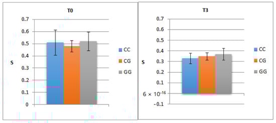 Correlation of pre- and post-treatment steatosis (three months post-SVR) with PNPLA3 genotype.T0—the initial visit; T3—the second visit; PNPLA3—patatin-like phospholipase domain-containing3; S—steatosis.