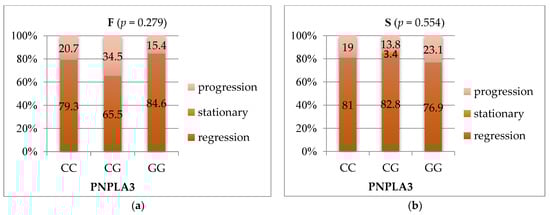 (a) Correlation three monthspost-SVR evolution of fibrosis with PNPLA3 genotype; (b) Correlation three monthspost-SVRevolution steatosis with PNPLA3 genotype. F—fibrosis; S—steatosis; PNPLA3—patatin-like phospholipase domain-containing3.