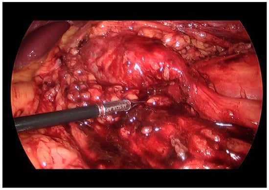 In the laparoscopy, a dilated left renal pelvis and abrupt narrowing of the UPJ is observed.