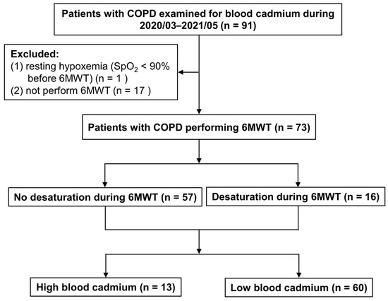 During the study period, a total of 91 patients with COPD examined for blood cadmium were included. After excluding 18 patients, a total of 73 patients with COPD were enrolled in the current analysis. A total of 16 patients (22%) who had desaturation during 6MWT (i.e., EID) were assigned to the desaturation group, and 57 patients (78%) to the no-desaturation group. The maximum Youden index value was used to categorize patients according to blood cadmium levels, using a cutoff point of 1.75 μg/L: high-blood cadmium group (13 patients; 18%) and low-blood cadmium group (60 patients; 82%) (Figure 1).