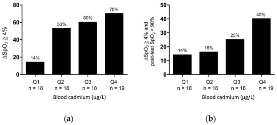 Frequency of (a) △SpO2 ≧ 4% or (b) △SpO2 ≧ 4%, and post-test SpO2 < 90% after 6MWT as stratified by quartiles of the blood cadmium concentrations in patients with COPD. Q1: first quartile (<0.8 μg/L); Q2: second quartile (0.8–1.1μg/L); Q3: third quartile (1.1–1.5 μg/L); Q4: fourth quartile (>1.5 μg/L).