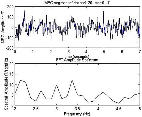 In order to score the Primary Dominant Frequencies (PDF) changes, we developed a software program [,,,,,], which detects the PDF of the power spectra of the MEG obtained from AD patients affected brain region prior and following weak TMS. The primary frequency of each signal was detected after applying Fast Fourier Transform (FFT), as is shown in Figure 1. There a 7 s duration MEG segment of an AD patient is shown, as well as the corresponding amplitude spectrum that is derived following the FFT analysis. The primary dominant frequency in the amplitude spectrum shown in Figure 1 is 2.1 Hz.