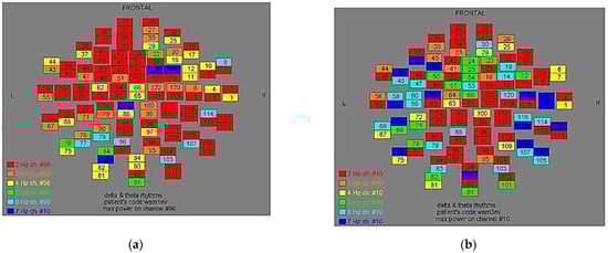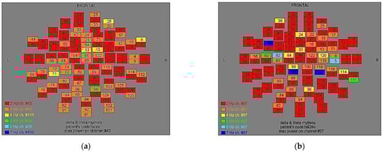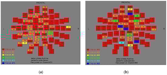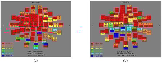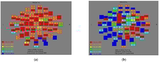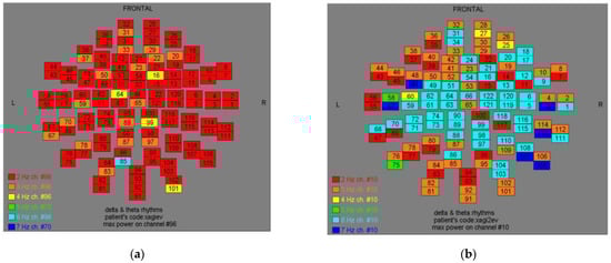 Two-dimensional color maps for the spatial distribution of the primary dominant frequencies were constructed based on these frequencies estimation for each affected brain region and channel. Each color in the maps depicts different primary dominant frequencies. Finally, each number in the map squares indicates groups of MEG channels, in line with the whole-head device for each brain area according to Table 1.