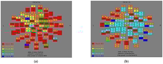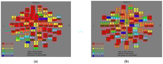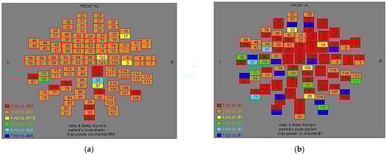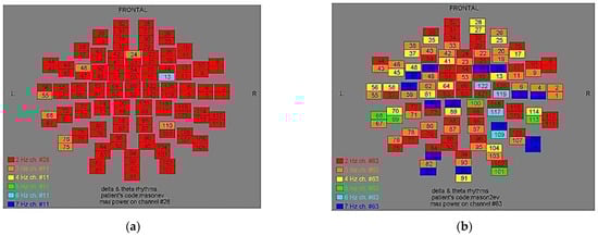 Finally, in Figure 2, Figure 3, Figure 4, Figure 5, Figure 6, Figure 7, Figure 8, Figure 9, Figure 10 and Figure 11, color maps depict frequencies alteration before and after magnetic stimulation of each AD patient.