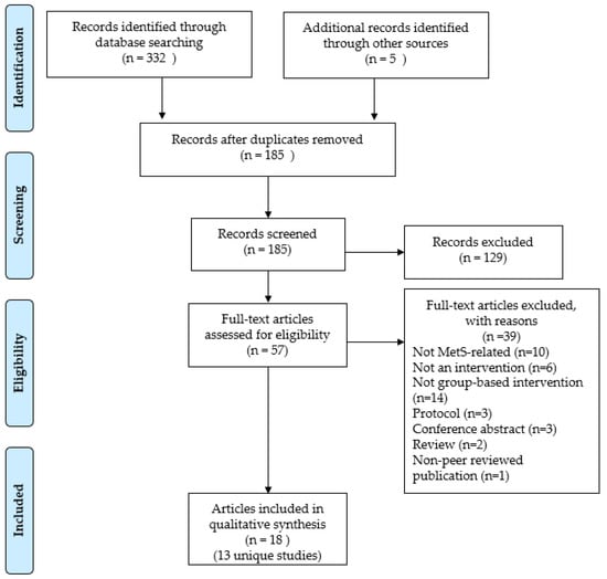 To be eligible, the peer-reviewed articles should be focused on (i) individuals with MetS, with MetS defined according to an established guideline, or (ii) individuals identified to be at risk for MetS. Peer-based intervention must have been designed in a group setting, where a peer or community member led the intervention. To improve the inclusivity of the studies, we also included interventions that reported interaction or interactive sessions between participants in a group setting.