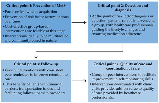 The peer-based program can support patient education, training, work planning, decision support, and treatment adherence in addition to routine clinic visits [10,50]. This added value to the quality of care provided by healthcare professionals. Peer-based programs, such as weekend classes, allow peer leaders to inform peers on MetS and improve self-monitoring skills following official clinic visits [51]. While the evidence of peer-based intervention points out improvement in MetS control, the outcomes of coordinated care between healthcare professionals and peers are still unknown. The details of coordinated care provided by peer-based intervention in addition to clinic visits are essential to ensure the continuity of care and informed decision making in MetS.