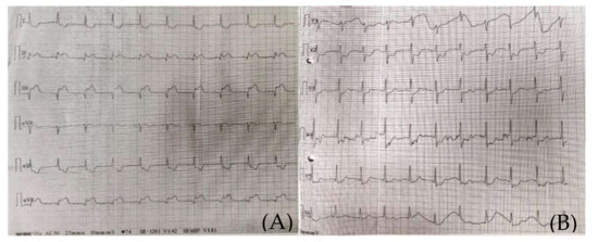 (A) (standard limb leads) and (B) (standard precordial leads). Emergency room 12-Lead ECG presenting an inferior myocardial infarction, ST-T segment elevation.