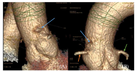 (A,B). 3D reconstruction of CTA(computed tomography angiography) image of the ascending aorta. Filling defect in the ascending aorta (blue arrow). Right coronary artery (orange arrow). Left coronary artery (green arrow).