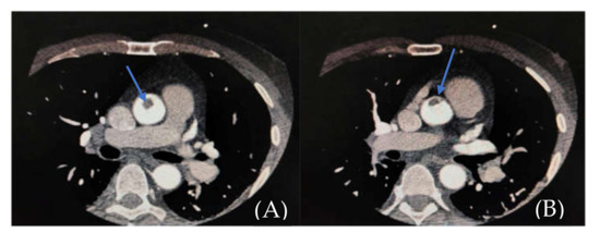 (A,B). CTA showing endoluminal aortic thrombus (filling defect in the ascending aorta—blue arrow).