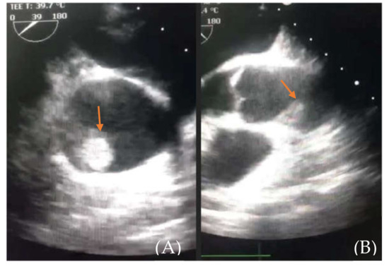 (A) (thrombus—orange arrow) and (B) (aortic root and thrombus). Emergency room transesophageal echocardiography showing the floating thrombus located in the ascending aorta.