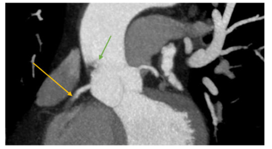 CTA image showing right coronary artery obstruction (yellow arrow) and the endoluminal thrombus (filling defect in the ascending aorta—green arrow).