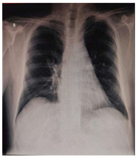 In the postoperative period, the patient maintained a dysfunctional, nondilated right ventricle and a moderate LV dysfunction (LVEF 35%). High doses of Dobutamine and small doses of Noradrenalin were necessary in the first 8 postoperative days. Otherwise, the patient was extubated on POD1 and showed no neurological or other end-organ deficit. The chest tube drainage was minimal. The postoperative chest X-ray was normal (Figure 7). The LV function improved under standard, guideline-prescribed pharmacological treatment (beta-blockers, ACE-inhibitors, digoxin, statin, aspirin, and clopidogrel).