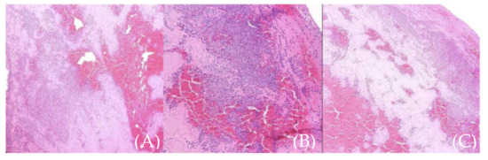 (A–C) (different sections of the same sample). Microscopic aspect of the thrombus (fibrin and white and red blood cells).