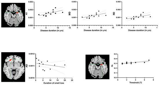 The aim of this study was to re-investigate whether there is an association between PD advancement and changes in olfactory brain areas. Three out of four DTI scalars, namely AD, MD, and RD in the left posterior piriform cortex, were found to be positively correlated with disease duration. This would support the results of a previous study suggesting that advanced stages of PD and increased severity of motor symptoms correlate with the degree of olfactory dysfunction [4]. The positive correlation between FA in the left posterior piriform cortex and the threshold score is in line with the notion that odor thresholds decline as a consequence of neurodegenerative progresses. The lack of a correlation for odor discrimination and identification scores can be explained by the idea that thresholds reflect aspects of olfactory processing related to the olfactory epithelium system, while odor discrimination and identification are more related to cognitive processes.