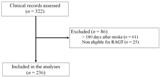 Three hundred and twenty-two stroke patients admitted in the rehabilitation clinics from 2007 to 2018 who received RAGT were assessed for eligibility. Eighty-six patients were excluded because they did not match the inclusion criteria (Figure 1). Within the analysed sample of patients, 91 were females (39%) and 145 were males (61%).