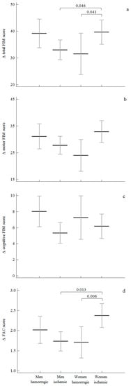 For both primary and secondary outcomes (FIM and FAC), within-group comparisons were performed via Wilcoxon tests. Between-group comparisons for all outcomes were obtained using Mann–Whitney tests due to nonnormal data distribution. For all outcomes, Kruskal–Wallis tests were conducted to determine gender differences according to stroke type (ischemic or haemorrhagic).