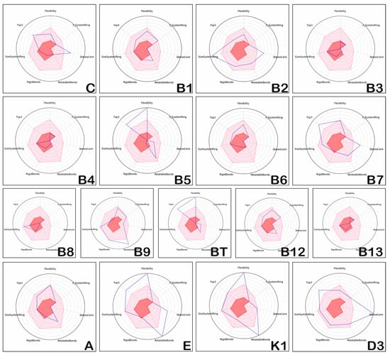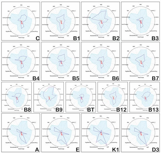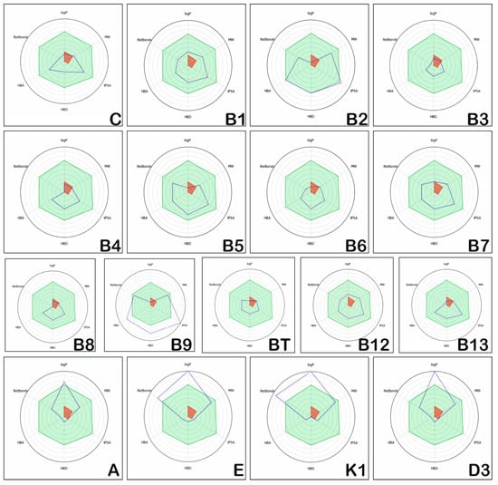 The positioning of the physico-chemical properties of hydro and liposoluble vitamins (the dark line in Figure 2) corresponds to the properties of most compounds with proven therapeutic potential (the light red area corresponds to the area of chemical compounds with biological activity and oral bioavailability). Studying Figure 2, we can state that the physico-chemical properties reflecting the structural complexity of vitamins (blue lines) do not correspond to those observed for drug-like compounds (light red areas). Vitamins C, B1, B9, B12 and A have physico-chemical properties that usually fit in the light red area, vitamins B3, B4, B6, B8 and B13 show a reduced structural complexity, and vitamins B2, B5, B7, BT, E, K1 and D3 illustrate increased structural flexibility. The same is true of the hydro-soluble vitamins, C, B2, B5, B7, B9 and BT. Moreover, vitamins C, B3, B4, B6, and B13 have properties in the forbidden area (dark red area).