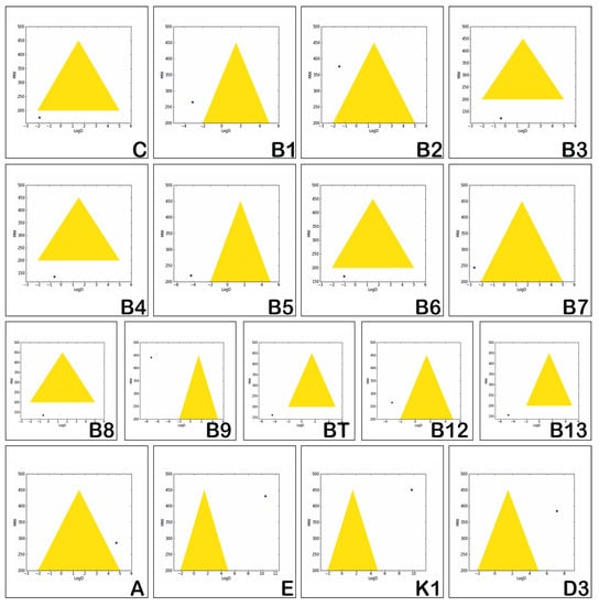Assessment of the in vitro permeability and metabolic stability of the investigated vitamins is based on the “Golden Triangle” visualization tool, and is illustrated in Figure 3. The properties involved are logD (the logP of compounds at physiological pH = 7.4) and MW [50]. The values of these two properties, which correspond to compounds reflecting optimal permeability and good metabolic stability, lead to a triangular shaped area named the “Golden Triangle”. Molecules having logD and MW values situated within this area are visualized by a black point and are considered as obeying the rules and reflecting good in vitro permeability and metabolic stability. Molecules having low logD and high MW values reflect low permeability and those having high values for both logD and MW reflect low metabolic stability [51]. These two situations point to a dark blue point that is situated outside the golden triangular area.