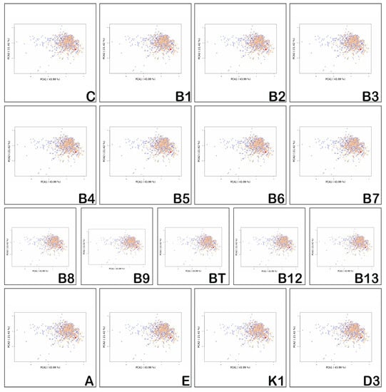 Figure 4 shows the application of the Principal Component Analysis (PCA) method of 15 physico-chemical descriptors to the investigated vitamins, as well as the positioning of the vitamin (red dot) against the chemical space of the 466 orally bioavailable compounds extracted from DrugBank [52] (orange dots) and the 916 compounds extracted from EDrugs [53] (blue dots). All of the hydro- and liposoluble vitamins have properties reflecting low oral bioavailability.