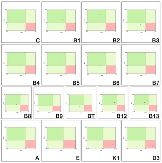 The use of the Pfizer’s rule for evaluating the toxicity of the investigated vitamins is illustrated in Figure 6. Pfizer’s rule considers logP and tPSA as molecular descriptors. According to this rule, the chemical space is divided into four regions: a dark green region for logP < 3 and tPSA > 75 Å2, corresponding to compounds without toxicity, and a light green region for logP < 3 and tPSA < 75 Å2, corresponding to Pihan et al. [53].