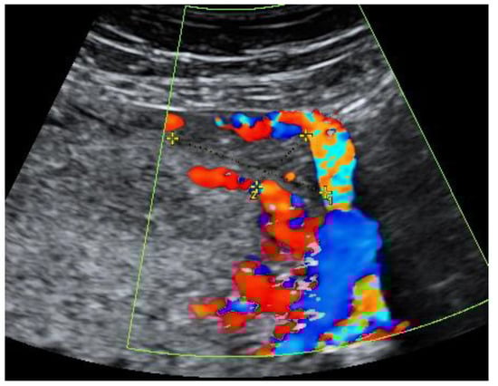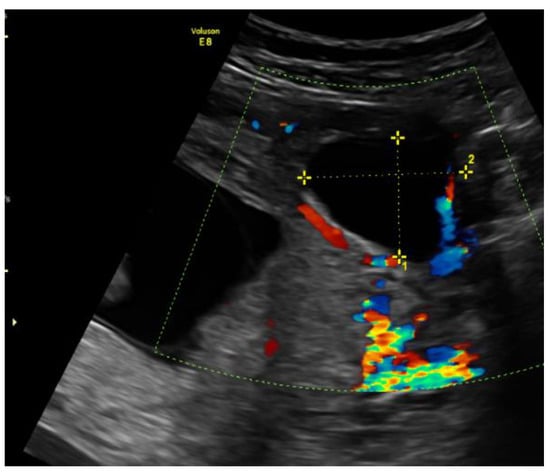 At the 41st week of gestation, the patient was admitted to the Obstetrics department due to the spontaneous rupture of membranes—transparent amniotic fluid was observed. A healthy female neonate (weight 2850 g, height 50 cm) with Apgar scores of 9 at 1 min and 10 at 5 min was born via spontaneous vaginal delivery in occiput posterior position. No Oxytocin was used during the labor. On the first day after delivery, transabdominal ultrasound was performed. A compressed mass of 3.3 × 1.4 cm remained visible in the left cornu of the uterus. Figure 7 Moreover, an intensified blood flow was observed on the left corner of the uterus in comparison with the right uterine corner. The postpartum and postnatal periods were uneventful, and the patient was discharged together with her newborn 2 days later.