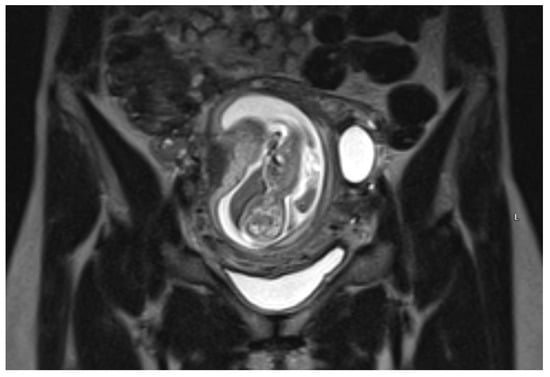 An urgent Magnetic Resonance Imaging (MRI) was performed. A 36 × 20 × 36 mm size cystic mass with T2-hyperintense wall in the left cornual region was observed. An MRI scan also showed one more fetus inside the uterine cavity with placenta located on the left lateral wall. Figure 2 The diagnosis of a heterotopic angular pregnancy in the left cornu of the uterus was established. The patient was hospitalized for further observation.