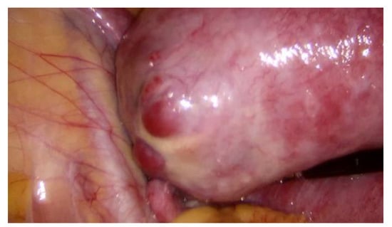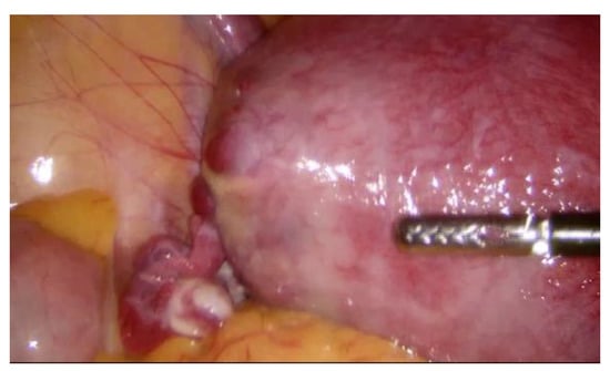 During hospitalization, blood and urine tests’ results were within the normal range. A multidisciplinary team (MDT) decided to keep monitoring the growth of both pregnancies by ultrasound while maternal vitals were stable and noted that further management would be determined according to the clinical situation. On the third day of hospitalization the patient started to feel more severe pain in the hypogastric region, radiating to the back and the left groin. The MDT made a decision to perform a diagnostic laparoscopy. Laparoscopy confirmed heterotopic angular pregnancy in the left enlarged, swollen cornu of the uterus. The left ovary and fallopian tube were not damaged and there were no signs of uterine rupture. Figure 3 and Figure 4.