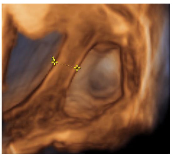 Left cornu of the uterus visualized by 3D transabdominal ultrasonography at the 22nd week of gestation.