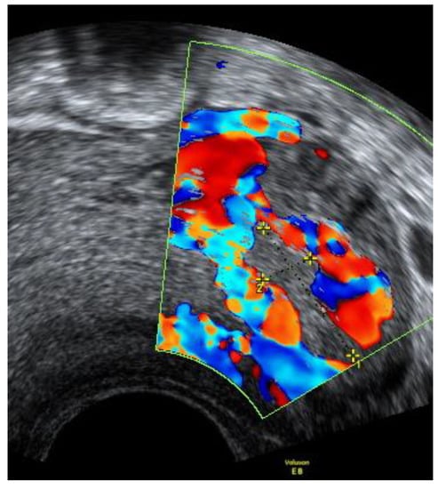 The follow-up transvaginal ultrasonography was performed after one month. The remaining mass sized 1.67 × 0.56 cm with visually more intensive blood flow was observed. Figure 8.