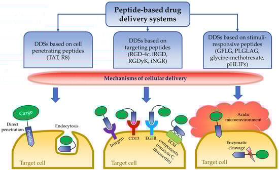 The idea of targeted delivery of drugs was first coined at the beginning of 20th century by Paul Ehrlich []. The concept arose from the fact that diseased tissue has various complex cellular and non-cellular components [], which might be targeted by drugs that can act as “magic bullets” selectively eliminating diseased cells without damaging healthy ones thereby improving the utilization of drugs and reducing their side effects [,]. Since those times, thousands of different DDSs that are capable of side-directed accumulation have been reported, and the concept of targeting was updated and divided into active and passive targeting. In passive targeting, drugs accumulate at diseased sites due to intrinsic characteristics of DDSs such as size, shape and charge, and due to distinctive properties of the targeted sites such as local vasculature and lymphatic drainage. At tumor sites, for example, nearby vasculature is leaky, and lymphatic drainage is impaired or absent []. Such conditions exhibit the so-called enhanced permeation and retention effect on DDSs, which allows preferential accumulation of polymers with high molecular weight as well as nanoscale particles of approximately 20–500 nm in diameter within the tumor tissue []. Active targeting is, in turn, receptor-directed and achieved by attaching receptor-specific ligands to the drug carrier or drug itself. Peptides being natural ligands for many receptors in our body have found a place among commonly used targeting agents in drug delivery. Most commonly, targeting peptides act as a delivery system for targeting various tumor cells or tissues due to overexpression of tumor-specific markers []. There are several molecular target candidates for this group of peptides including integrin receptors, aminopeptidase N, extracellular matrix (ECM) components and EGFRs (Figure 1).