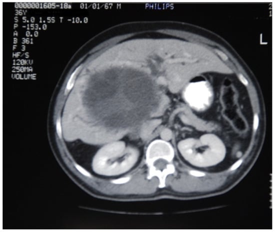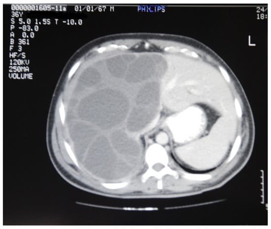 HD can involve almost every part of the body; however, the liver is the most commonly affected organ (75%), followed by the lungs (15%) and other locations, such as the brain (2%) or the spine (1%) [,,]. Without treatment, hydatic cysts gradually grow and can develop fistulas with adjacent organs or the biliary tree. The hydatic cysts may also rupture into the peritoneal cavity causing an anaphylactic reaction and the seeding of secondary cysts, develop daughter cysts within, or die []. The rupture of a hydatid cyst can occur in 50–90% of cases, leading to an allergic response due to the presence of antigenic cyst content in the surrounding structures. These clinical syndromes may lead to a patient’s death, but treatment does not ensure improvement of the patient’s quality of life [,,,,].